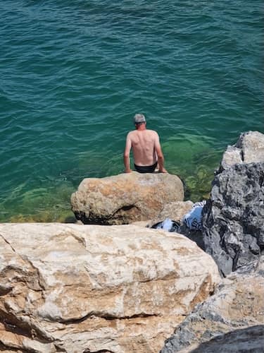 Hier gab es zwar auch keinen Strand, aber eine Ufermauer aus dicken Felsbrocken, die ein Hafenbecken abschloss. Auf dieser Steinmauer kletterten wir bis zum Ende aus der Sichtweite jeglicher anderer Personen. Ein paar Steine konnte ich hinunterklettern, dann war ich am Wasser, entledigte mich meiner Kleider und tauchte ins zunächst kalte Wasser ein.