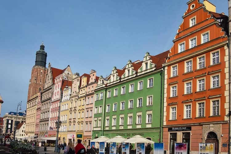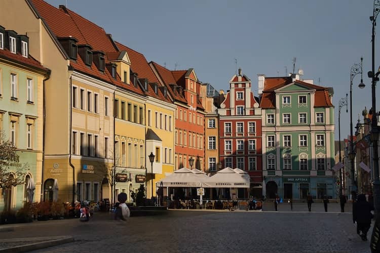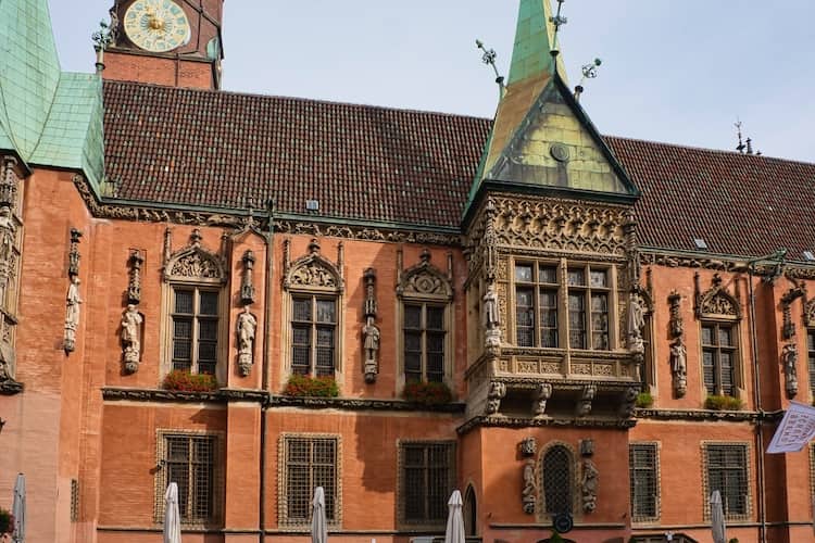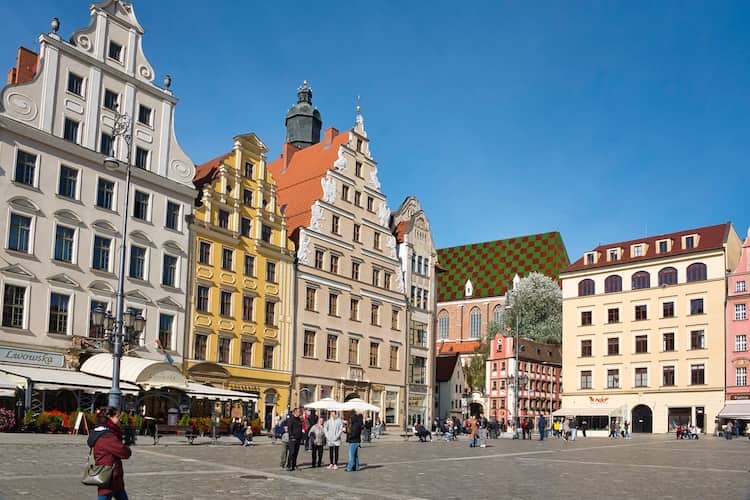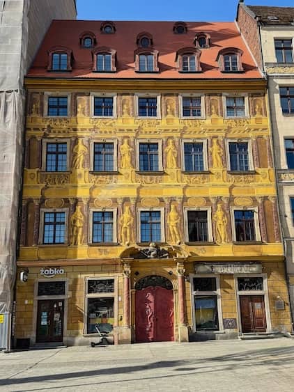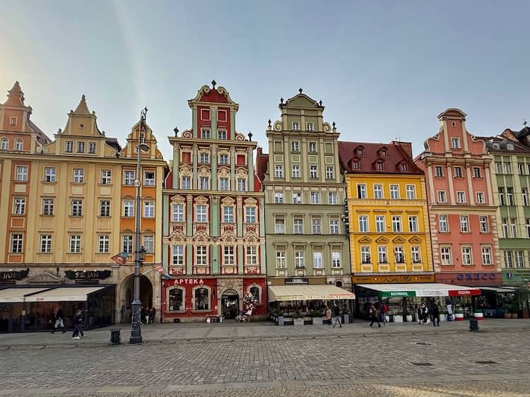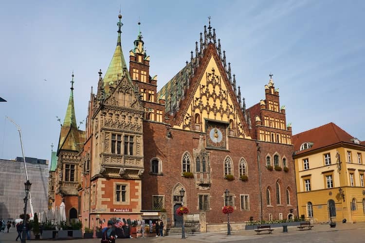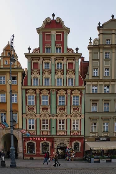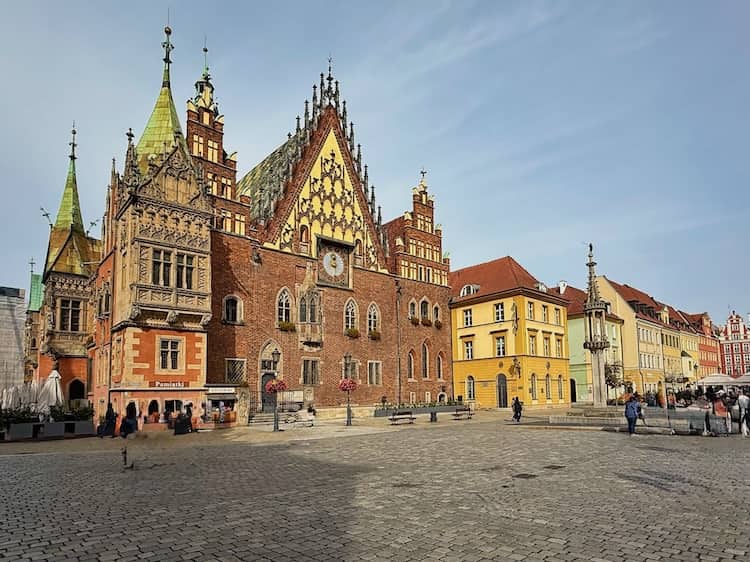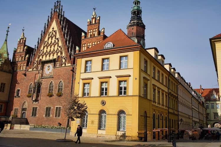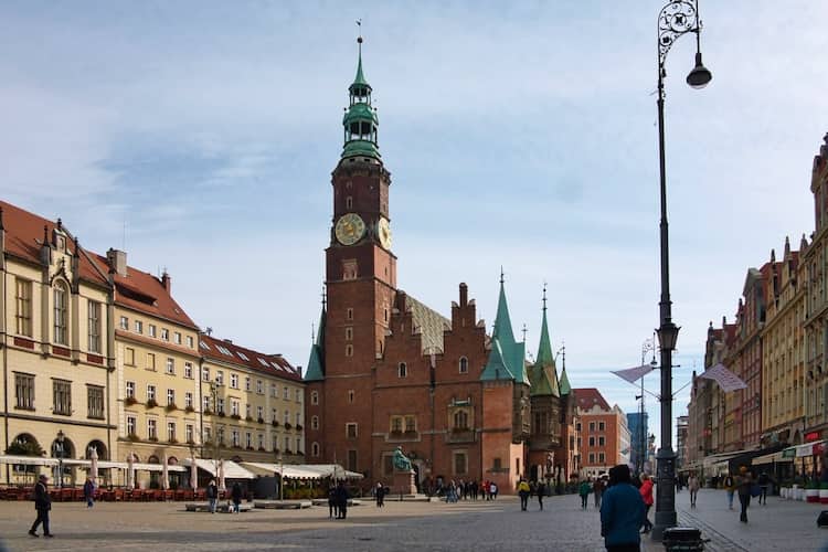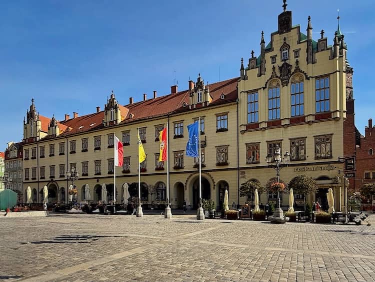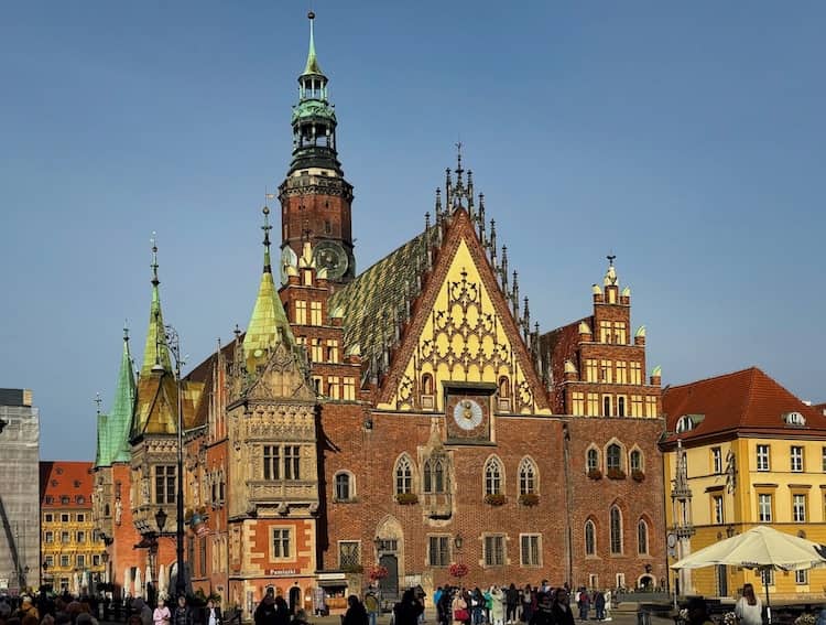 Nach einer nicht ganz so ruhigen Nacht aber schönem Wetter am Morgen beeilten wir uns aufzubrechen zu einer Stadtbesichtigung in Breslau. Wir ließen den Wagen auf dem Platz stehen und gingen zu Fuß. Sehr weit war es nicht bis zum zentralen, riesigen Marktplatz, in dessen Mitte das alte und das neue Rathaus stehen. Es war zwar sonnig und der Himmel leuchtete hellblau, doch es ging ein recht kalter Wind. Die Altstadt von Breslau gilt als die am besten restaurierte in ganz Polen, dennoch geben wir Danzig den ersten Platz, obwohl dort längst nicht die gewaltigen Dimensionen der Restaurierungen anzutreffen sind. Wir konnten uns nicht satt sehen an all den schönen wieder hergerichteten Gebäuden. Und überall Restaurants und Bars.