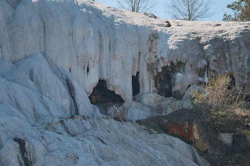 Auf einmal tauchte rechterhand ein weißer Hang auf, bei genauerem Hinsehen wie die Sinterterrassen von Pamukkale. Oberhalb ein Häuschen. Also fuhren wir den Hügel hoch, stellten den Wagen ab und schauten uns um. Wir waren beim Mineralbad Akkayalar, allerdings war geschlossen und außer dem Parkwächter niemand anwesend. Dieser erklärte uns, dass erst in ca. zwei Monaten der Badebetrieb losgeht, da es jetzt noch zu kalt sein.