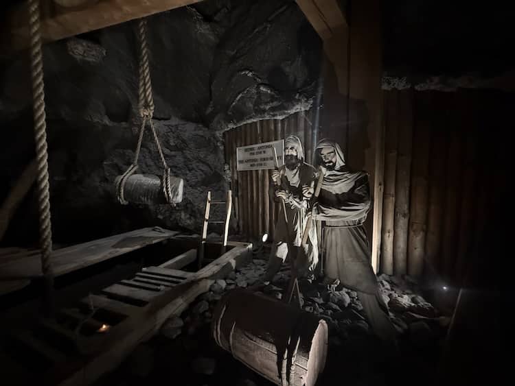 Punkt 15:00 Uhr ging es los, zunächst über Treppen ca. 60 Meter hinab. Dann ging es durch viele Gänge, alle mit Holz ausgekleidet wie es in Bergwerken üblich ist.