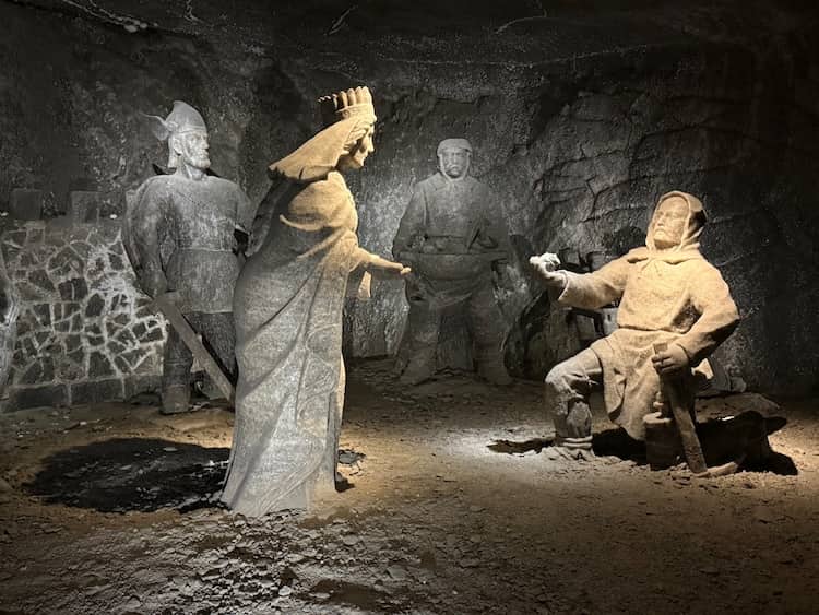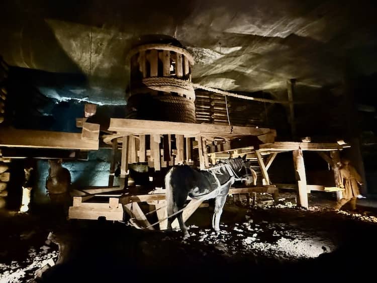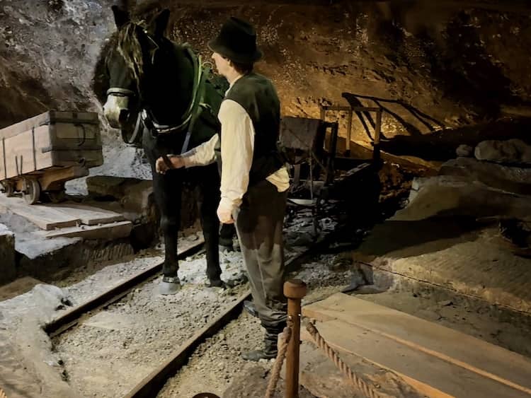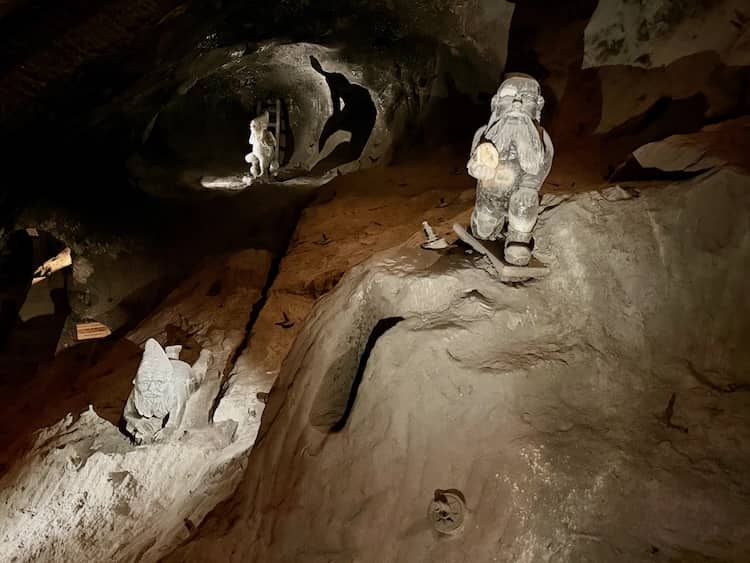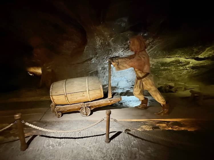 Wir besichtigten den ältesten Teil des Bergwerks, hier begann der Salzabbau bereits im 15. Jahrhundert. In den Tiefen der Schächte waren vereinzelt Szenen aus den frühen Bergwerkstagen mit Figuren und Gerätschaften dargestellt, aber auch hier und da verstreute Zwerge aus Steinsalz.