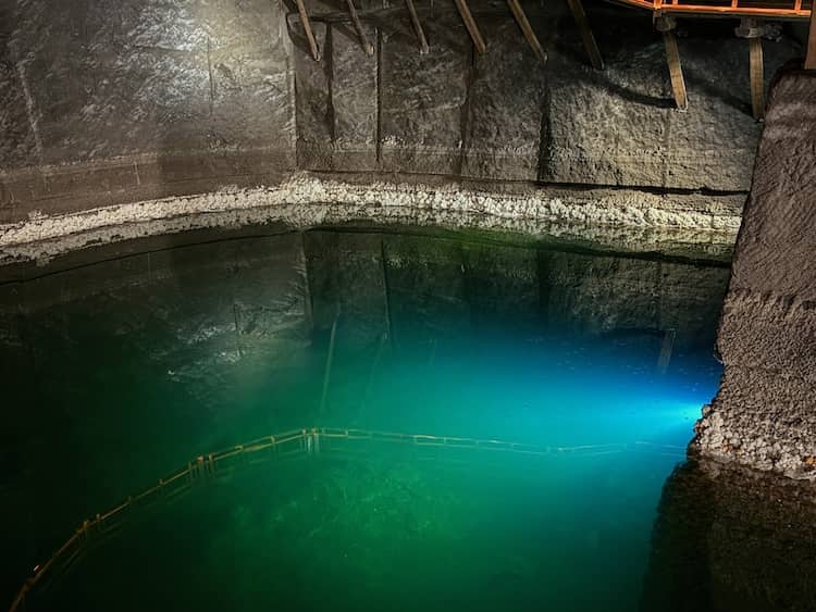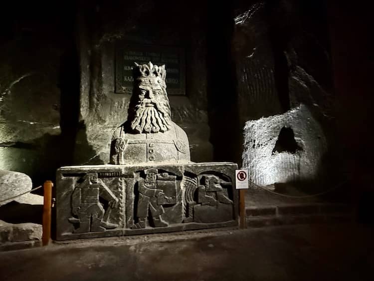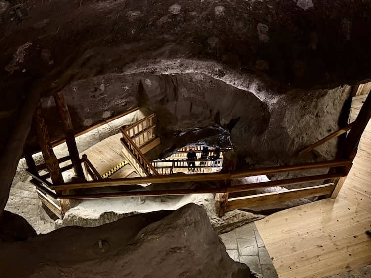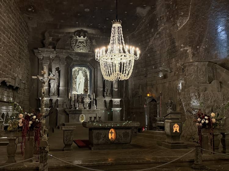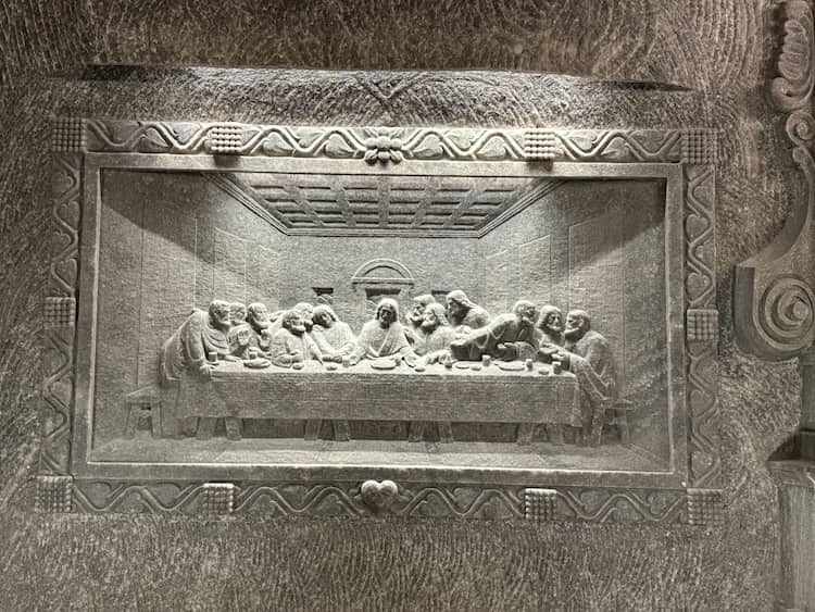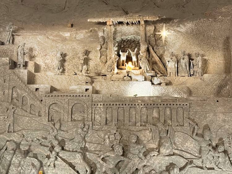Immer weiter hinunter ging es über steile Treppen und immer wieder kamen wir in große Hallen. Auf ca. 110 Metern unter der Erde erwartete uns eine riesige Kapelle mit zahlreichen Steinbildhauereien an den Wänden und Kronleuchtern an der Decke.