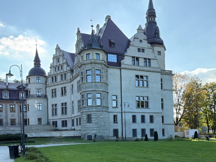 Beate wartete im Wohnmobil und überbrückte die Zeit mit Computerarbeit. Dann brachen wir auf zum nächsten Ziel, dem Schloss Moschen, auch etwa eine Fahrstunde von Gleiwitz entfernt.